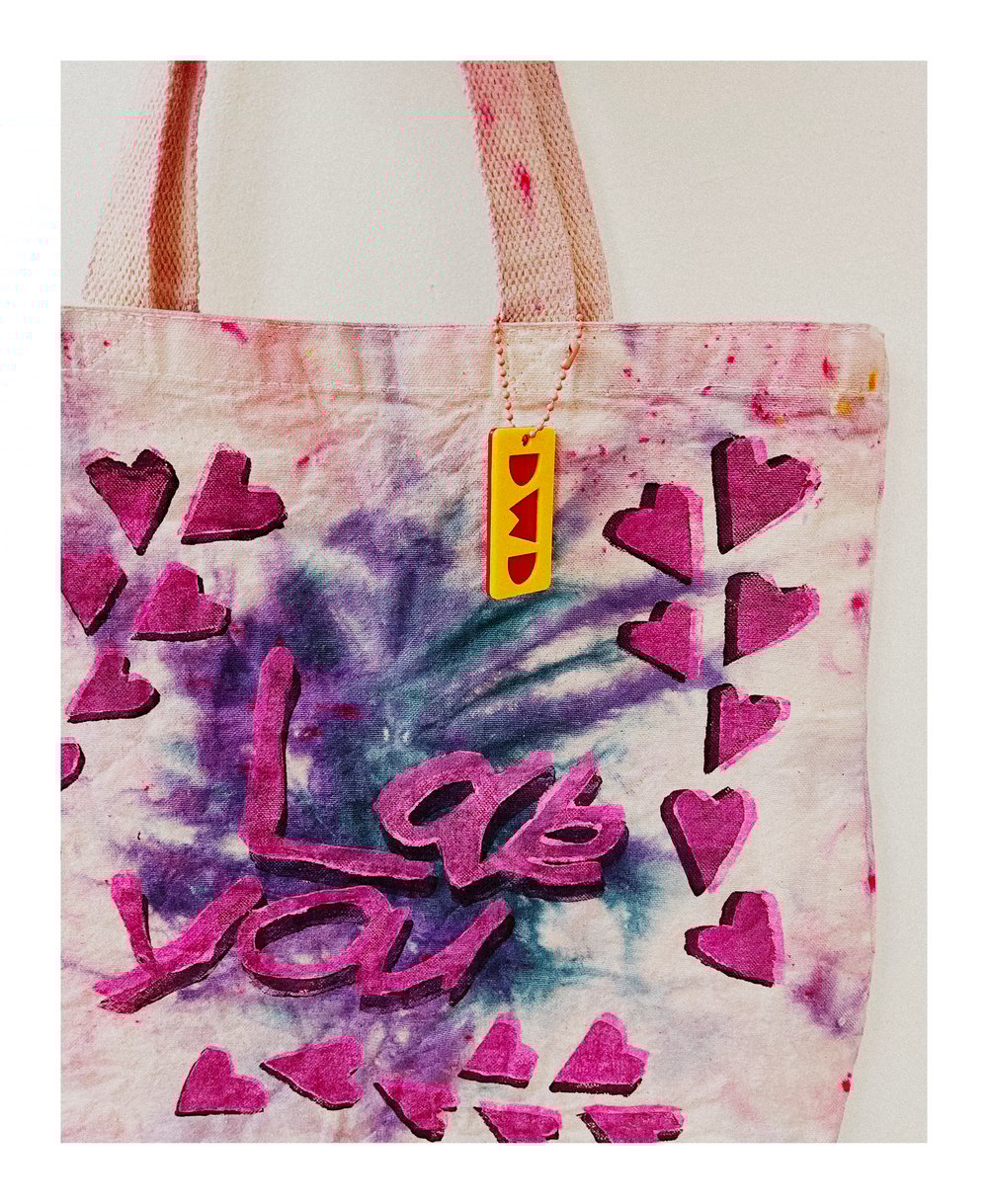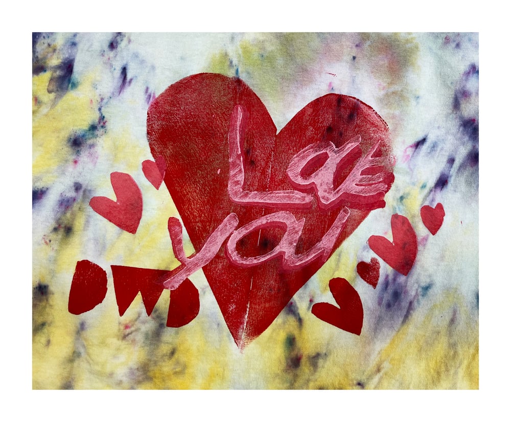 Made to order hand dyed and stamped shirts. Green and gold ink over a tie dyed heart. “Look here ladies and gentleman, When your significant other keeps asking if you love them, then wear this shirt right here, that tells them ‘I love you already but get off my back’”. -Deweese White.